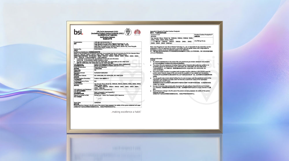 GCL has received a Life Cycle Assessment Verification Statement issued by British Standards Institution (BSI), an internationally authoritative certification organization, confirming a cradle-to-gate carbon footprint of 14.2756 kg of CO₂ equivalent per kilogram of granular silicon produced at its Baotou base.